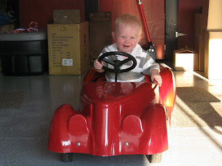 around 12:00 after several detours in Minnesota leading us through podunk towns. We showed up at Grandma and Grandpa Kappenman's house and there awaiting me was a nice red ride courtesy of Grandpa Kappenman. I loved this car, and this car loved me. I could sit in it and push it backward, and then get out and push it forward. A little while later my cousin Anna showed up with her parents and we headed to lunch at Jimmy Johns. I didn't eat much though because I was sprouting a molar that was bugging me. After lunch we headed over to meet Oscar, Anna's dog. Oscar is a minature pincher that barks non-stop and jumps constantly; this made me laugh non-stop. We ended the day at the grandparentals with dinner, pushing the red car and playing with my cousins. I even took a bath in a big tub and played with a tin cup thanks to Grandma's antiques. I stayed the night at my cousins Bryce and Danny's house.
